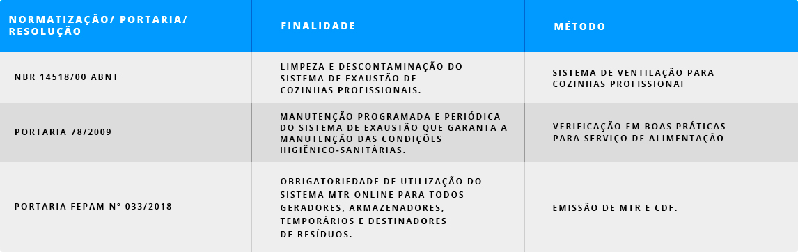 Conforme determinação técnica da NBR 14.518/00, a cada 6 meses deverá ser inspecionado o sistema de exaustão. Caso, qualquer parte do sitema, o acúmulo de gordura for superior a 6mm, deve-se realizar a Manutenção Higiênico-Sanitária. NBR 14518/00 da ABNT 6.2.1.1 – Manutenção do Sistema - Sistema de ventilação para cozinhas profissionais.